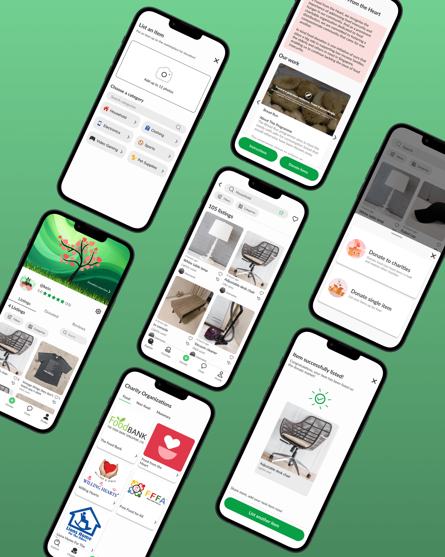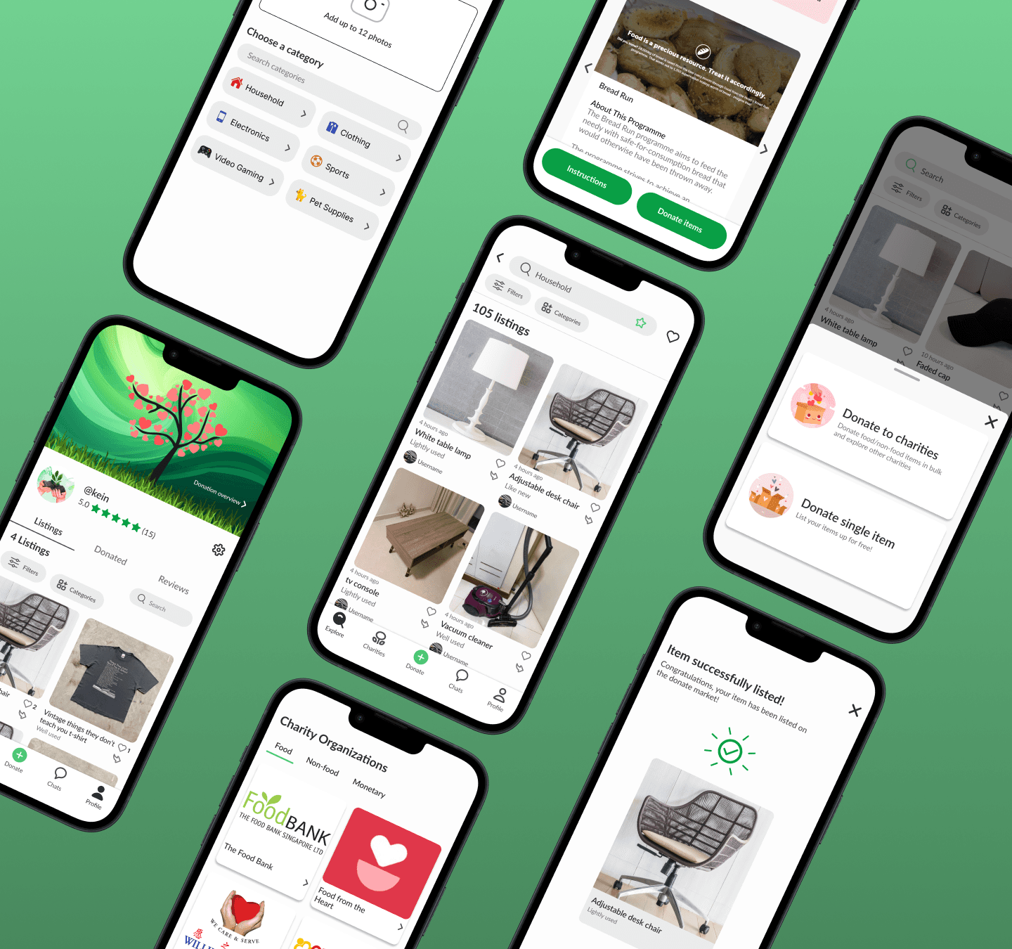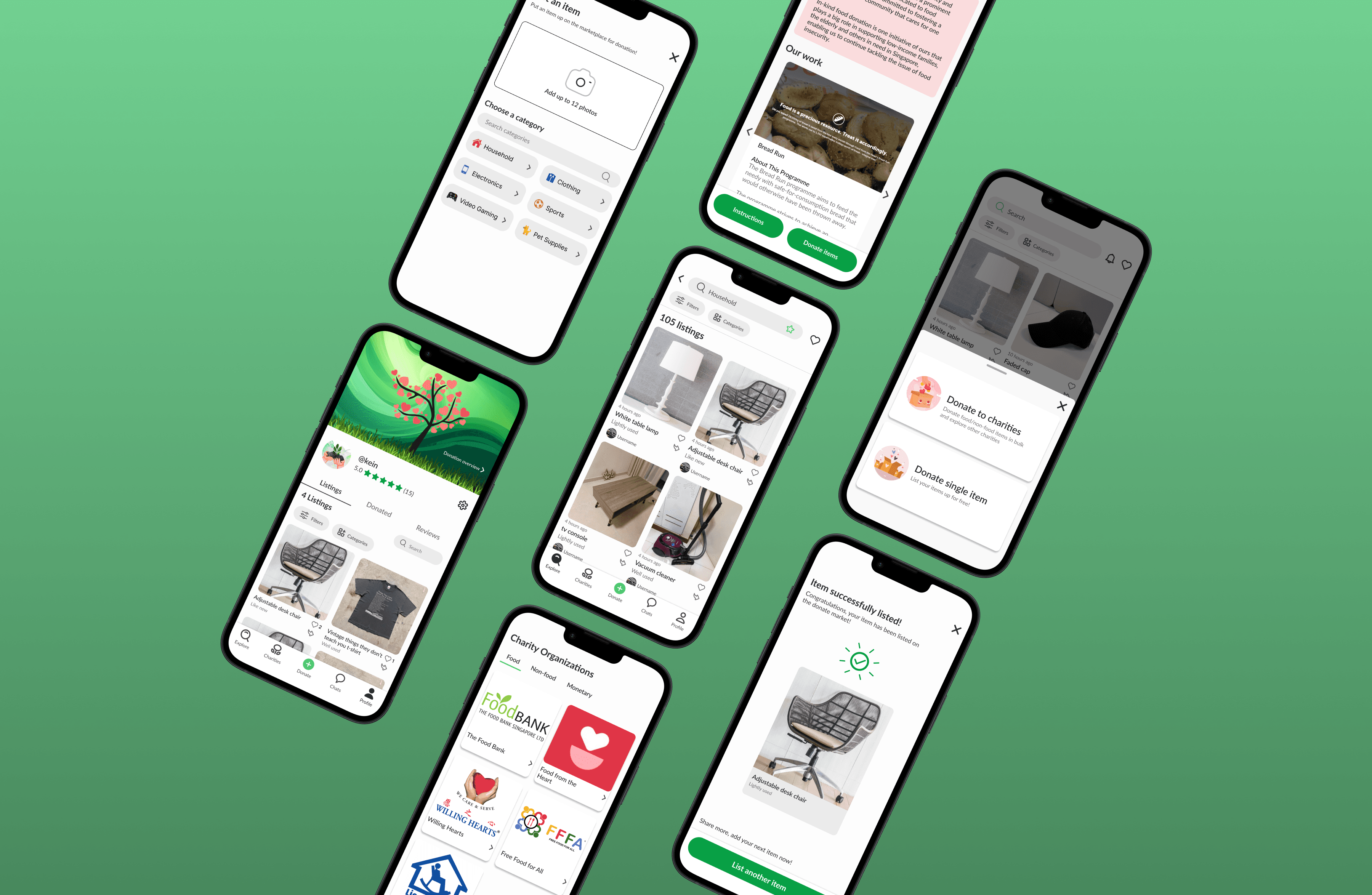 It includes two main functions of the app: donating singular items through the marketplace or donating through charities
